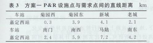 在嘉定西站设置P&R设施时,拥车出行者选择各出行方式的比例见表2。停车换乘使用比例较高的3个区域分别是南门(68)、老城(51)和菊园东(26),比例较低的4个区域则是菊园西(10)、南西(81)、南东(106)和马陆(96)。