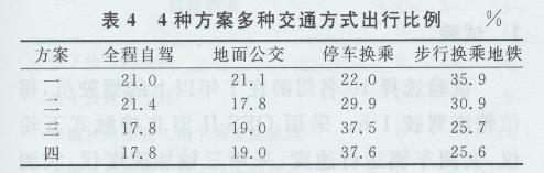 (1)公共交通出行比例。根据表4,对比方案一和二,后者停车换乘出行者比例明显提高,增幅7. 9%,说明在区域内,当P&R设施设置在距离目的地更近、使车辆不发生背离目的地行驶的地铁车站时,吸引力更大。对比方案二和三,后者停车换乘出行者比例进一步明显上升,增幅7.6%,对比方案三和四,停车换乘出行者比例基本持平,该现象说明在区域内集中设置多处P&R设施对于增加停车换乘吸引程度的效果有限,在实际情况中,如果考虑土地价值、建设成本等因素,新增P8LR设施可能是一种高投入低产出的行为。