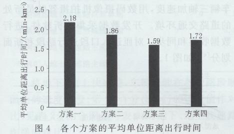 在得到各个方案的仿真结果后,对数据进行整理,得到4种方案多种交通方式出行比例以及对应的平均单位距离出行时间,见表4和图4。